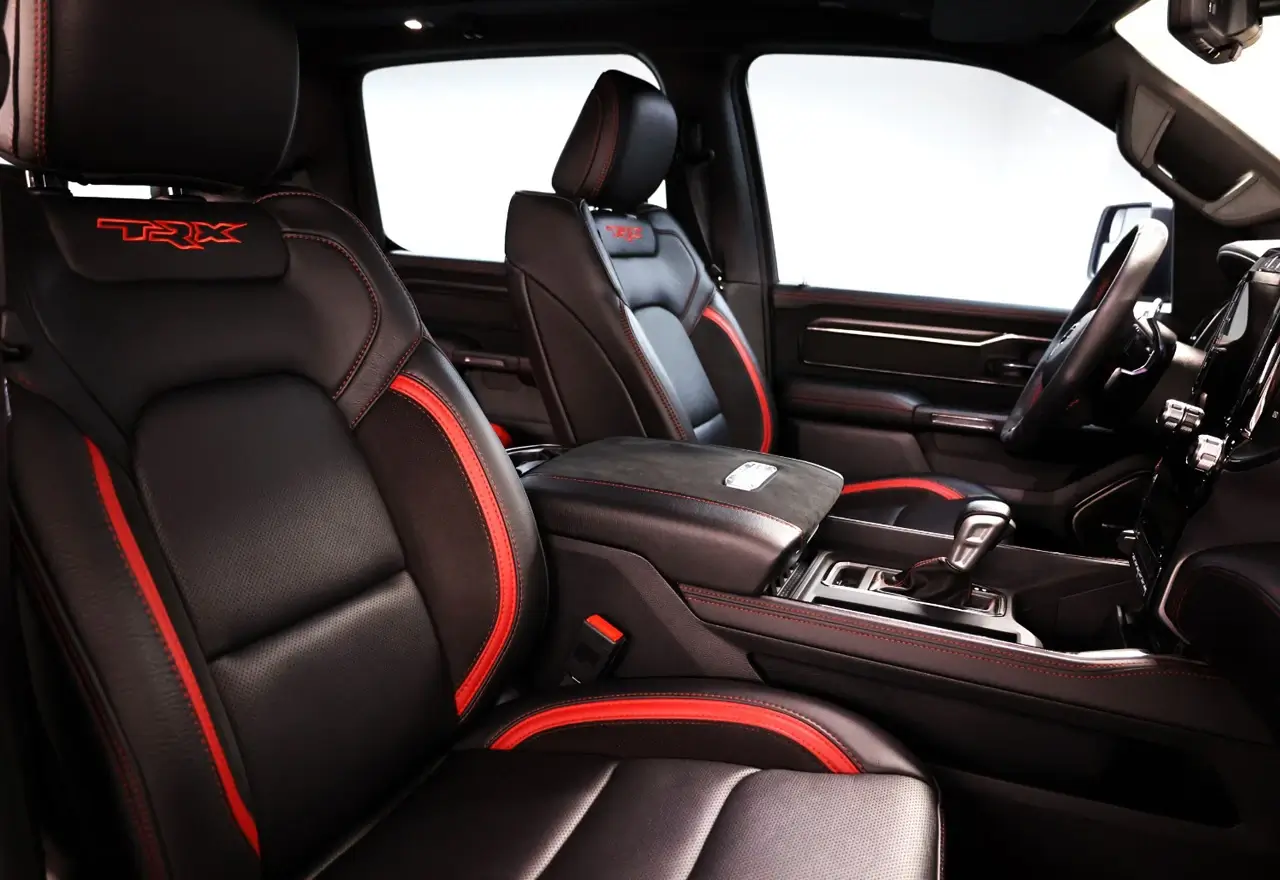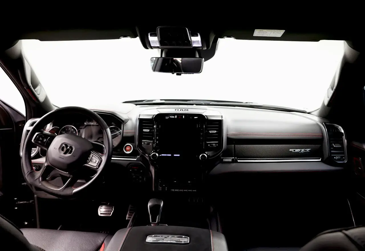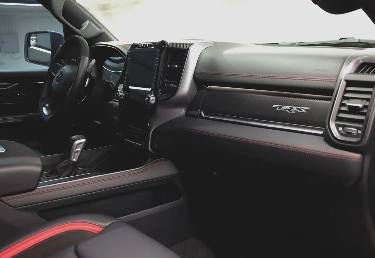 The interior of the Dodge Ram TRX is just as impressive as its engine. The cabin is spacious and comfortable, with premium materials and finishes that give it a high-end feel. The seats are upholstered in leather and suede with TRX logos embroidered on the headrests, while the dashboard and door panels have carbon fiber accents.