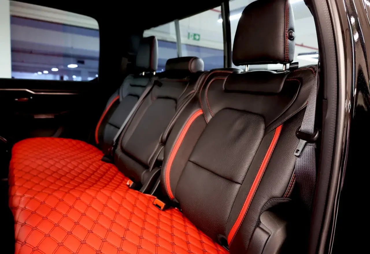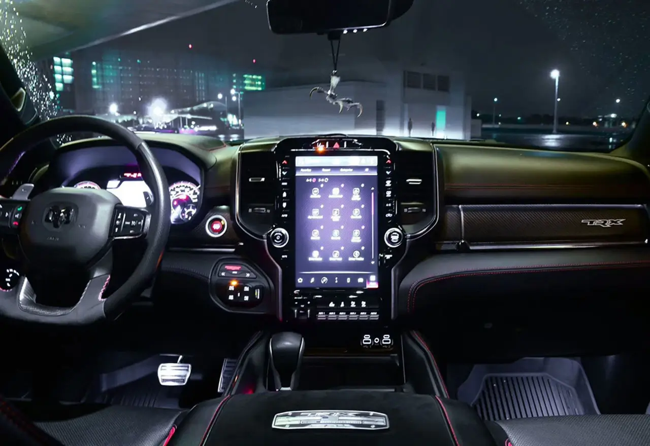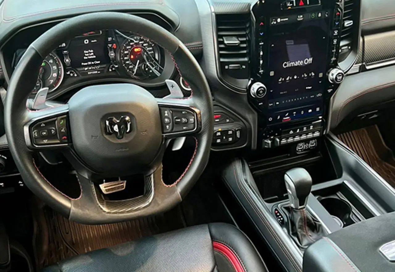 The interior of the Dodge Ram TRX is just as impressive as its engine. The cabin is spacious and comfortable, with premium materials and finishes that give it a high-end feel. The seats are upholstered in leather and suede with TRX logos embroidered on the headrests, while the dashboard and door panels have carbon fiber accents.
