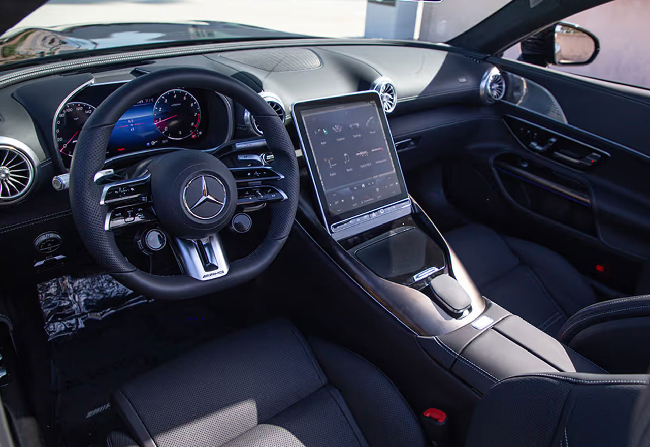 Beneath the hood of the Mercedes SL 63 Roadster Black, you’ll find a handcrafted 4.0-liter V8 biturbo engine, delivering an astonishing 577 horsepower and 800 Nm of torque. This beast accelerates from 0 to 100 km/h in just 3.5 seconds, offering a thrilling, race-inspired drive. The 9-speed AMG SPEEDSHIFT transmission ensures seamless gear changes, while the AMG Performance 4MATIC+ all-wheel drive enhances stability and handling. Whether you're pushing the limits on Sheikh Zayed Road or enjoying a smooth ride through the city, the SL 63 Roadster delivers power with precision.