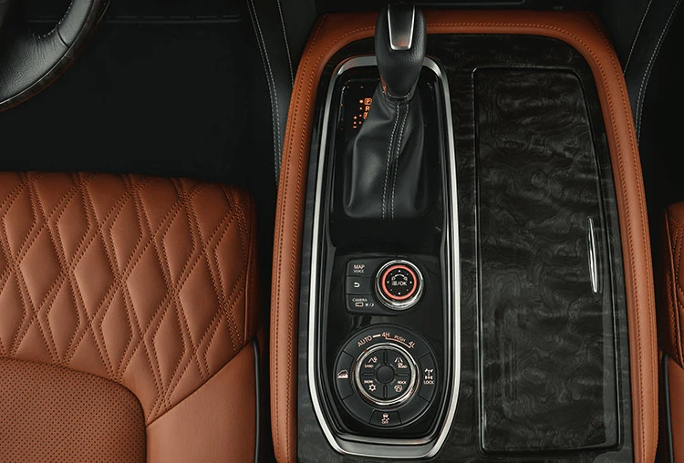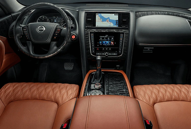 The new Patrol's luxurious interior creates a sophisticated ambiance that is open, friendly, and comfortable. They have incredibly cozy diamond stitch quilted leather seats available. The nearby wood veneer trim enhances the atmosphere. The new Patrol also remembers your selections, so the seats will always be comfortable before you sit down in them.