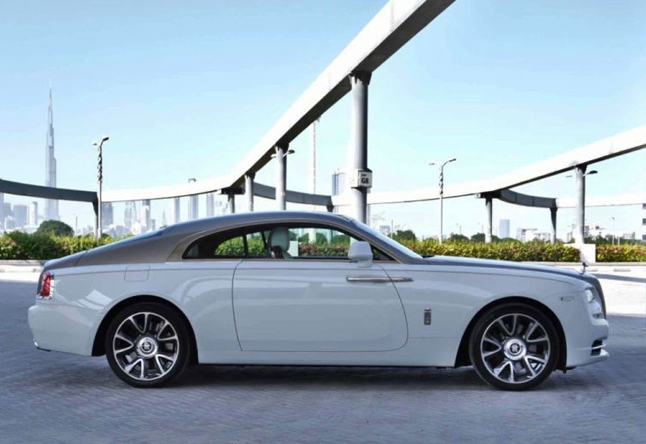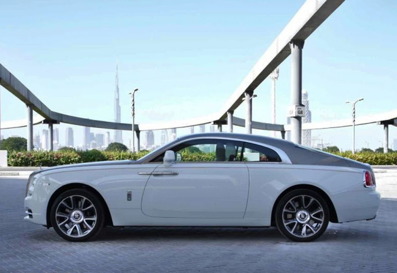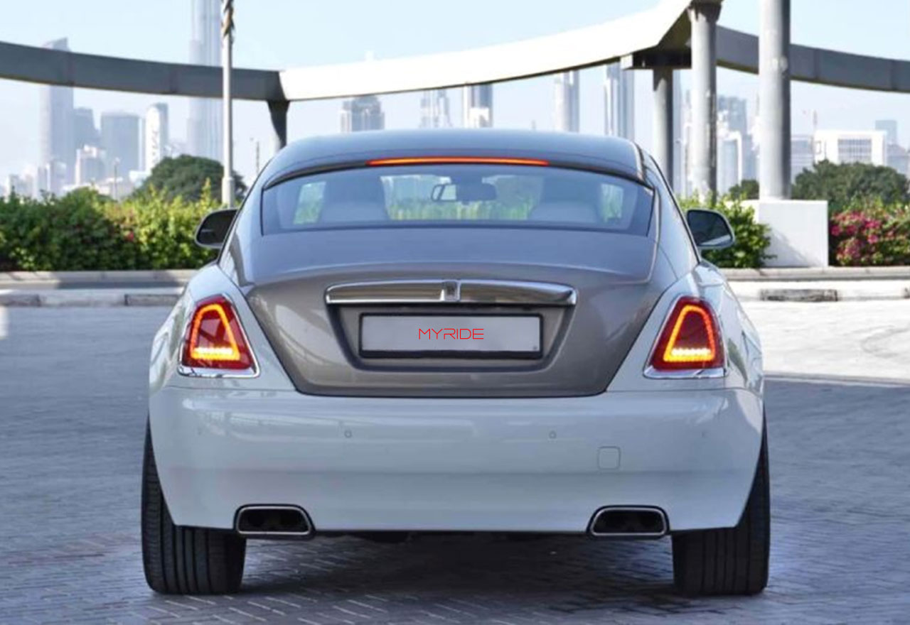 Rent Rolls Royce Wraith in Dubai at the best price from RentMyRide. The rental cost is inclusive of the standard mileage limit - 250Kms and basic insurance coverage. This Rolls Royce Wraith for rent in Dubai 2 door coupe has a seating capacity of 4 persons and fits 2 medium-sized suitcases in its boot perfectly.